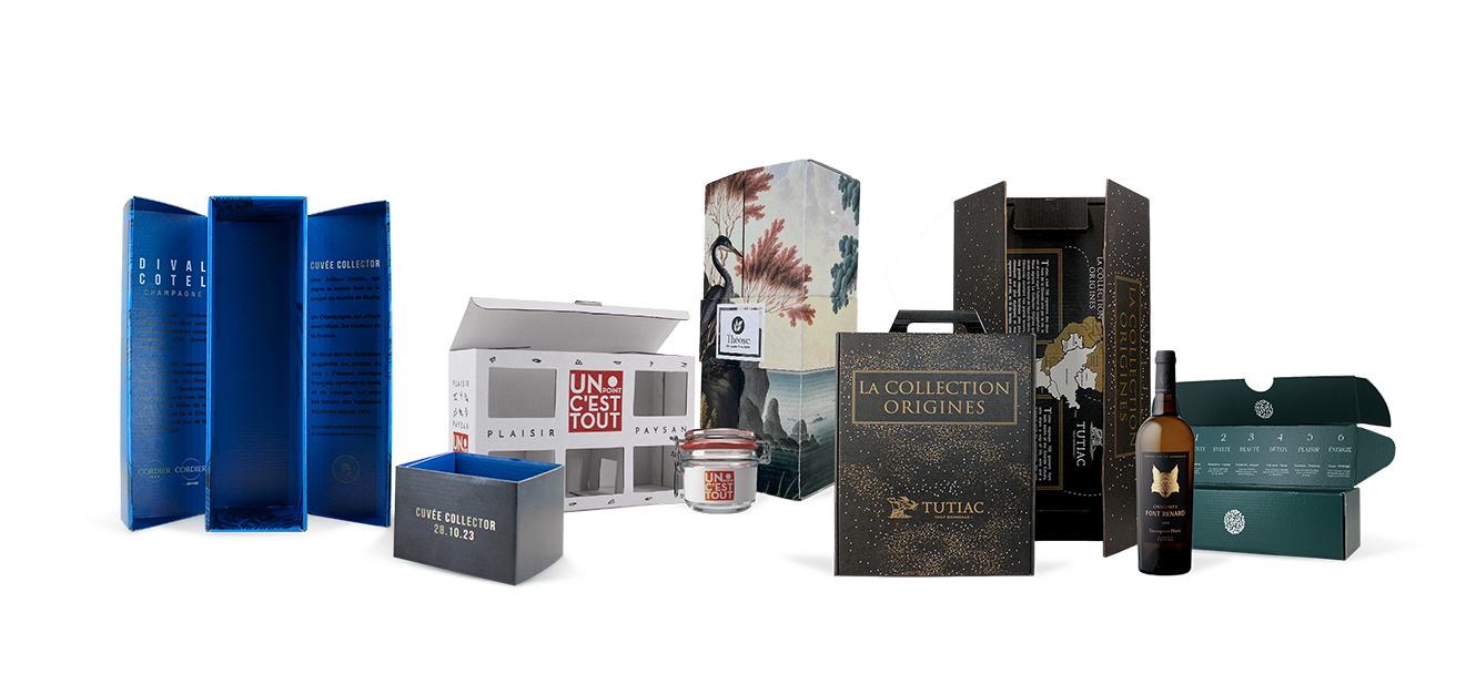 Nos étuis, coffrets et emballages en carton sont personnalisables. Nous proposons différents modèles qui s'adaptent à tous types de bouteilles, y compris Bordeaux, magnum, champagne et Bourgogne. Des emballages idéaux pour valoriser vos bouteilles de vin et spiritueux. Parfaits pour des coffrets cadeaux et des gammes premium, ils offrent un emballage fiable, pratique et soigné.